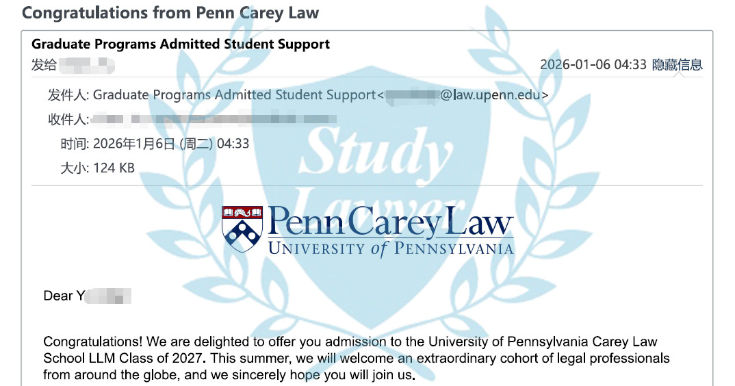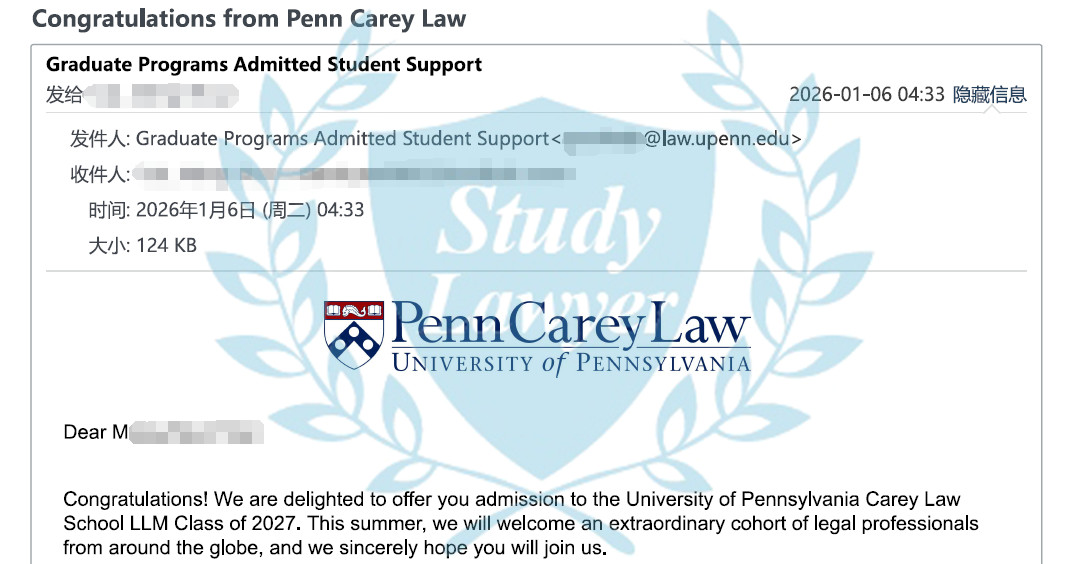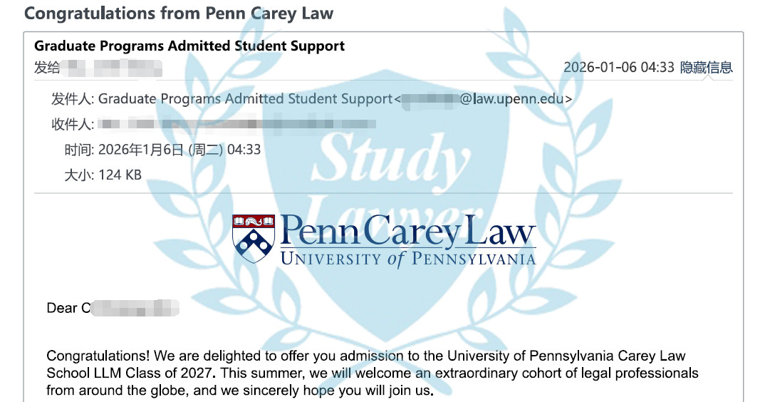 今天,十多位學律申請者收到了賓夕法尼亞大學Carey法學院今年秋季入學的LLM錄取通知,恭喜!