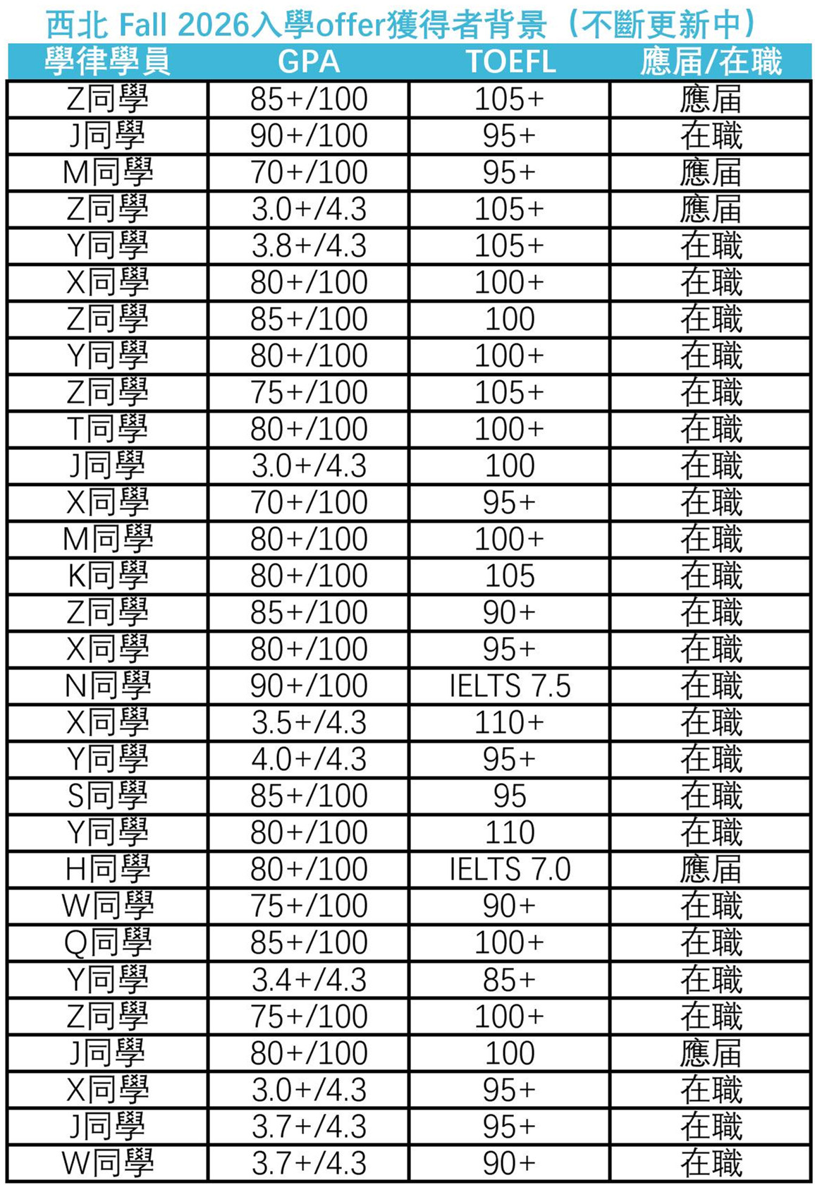 今天再度放榜後,學律申請者在當前申請季收到的西北LLM offer已累計達到30張,以下是錄取者的一些背景情況: