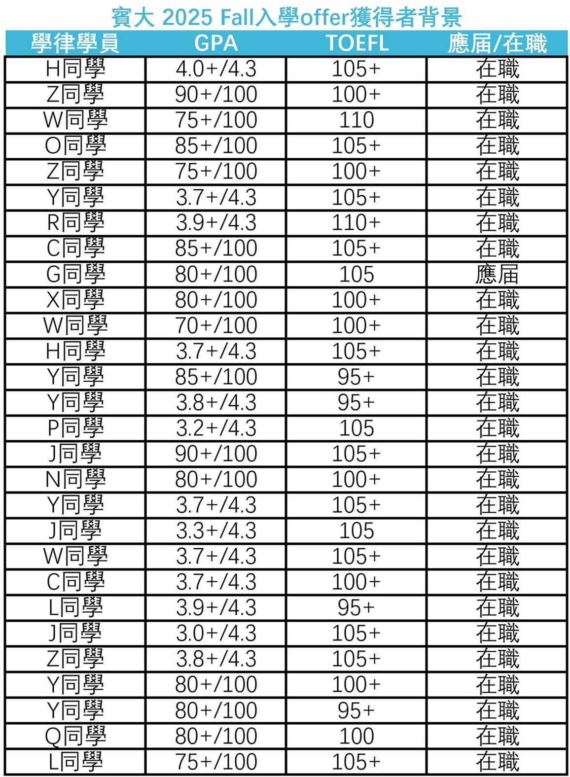 賓大並未透露LLM新生的硬性條件,比如TOEFL分數或者第一法律學位期間的GPA,但我們的申請結果可以為大家提供一定的參考: