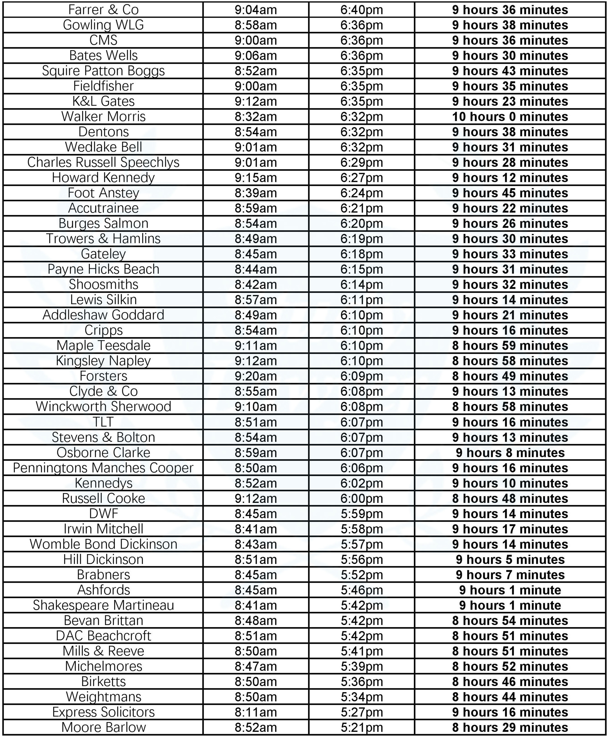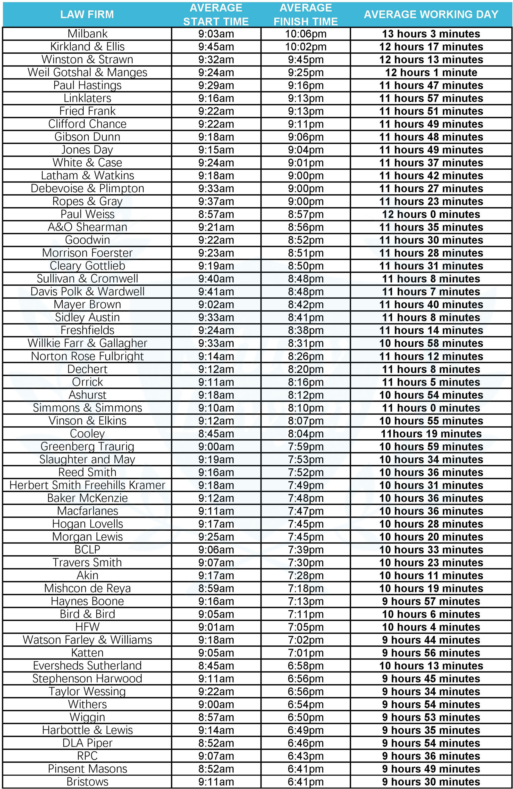 以下是按平均工作時長(Average working day)由長到短進行排名的100+家律所的清單以及他們的平均開始上班時間(Average start time)和平均下班時間(Average finish time)。