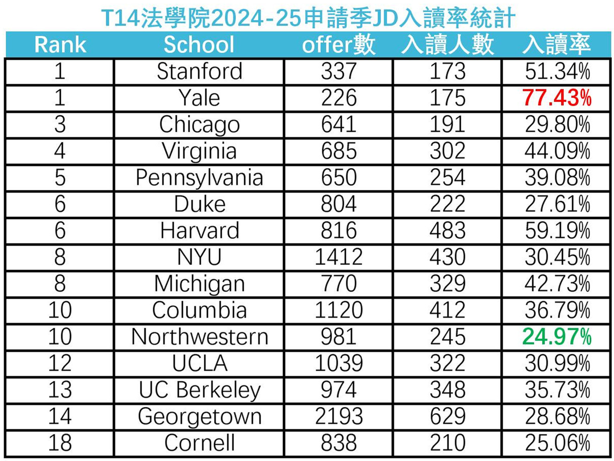 康乃爾法學院(25.06%)、杜克大學法學院(27.61%)、喬治城大學法律中心(28.68%)和芝加哥大學法學院(29.80%)的入讀率也未達30%。