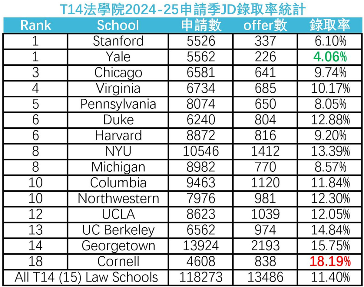在2024-2025申請季,傳統T14法學院以及新晉T14 UCLA(共15間)共收到申請118,273份,共發出錄取通知13,486份。