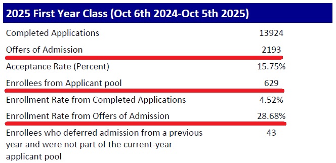 “入讀率”(enrollment rate from offers of admission)指的是接受了offer並選擇當年入讀的學生占發出的offer總數的比例。以喬治城為例(上圖),該校在2024-2025申請季共發出2193張offer,其中629人在2025年秋成為了喬治城JD項目的1年級新生,占到offer總數的28.68%,而其他拿到喬治城offer的申請者沒有選擇入讀喬治城(至少沒有在今年入讀喬治城)。