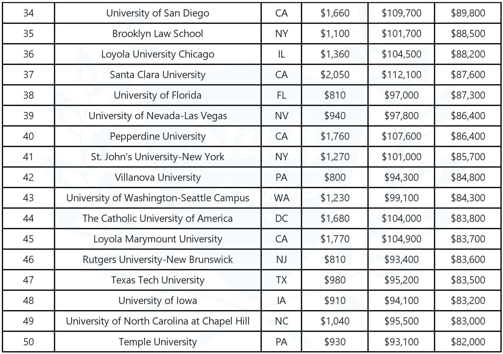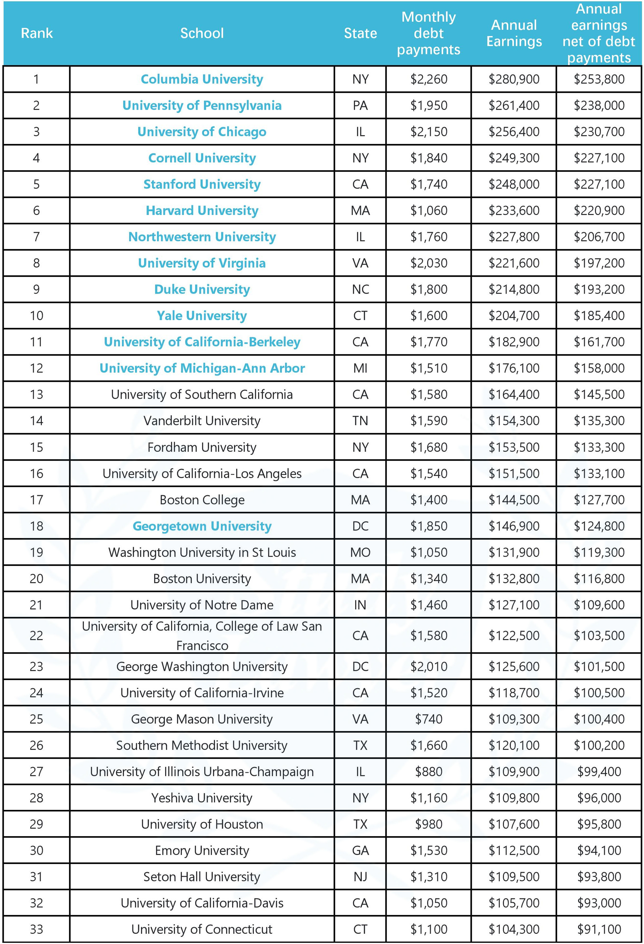 根據喬治城大學教育與勞動力研究中心(CEW)發佈的一份報告,186所法學院畢業生畢業4年後的扣除債務後中位數收入為7.2萬美元,但有7所法學院超過20萬美元,分別是哥倫比亞大學、賓夕法尼亞大學、芝加哥大學、康乃爾大學、史丹佛大學、哈佛大學和西北大學。