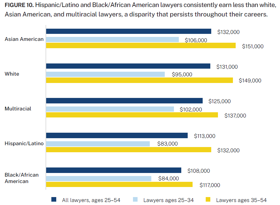 無論哪個年齡段,亞裔都是薪資最高的。在25-54歲、25-34歲、35-54歲這三個年齡段,亞裔律師的薪資中位數分別達到了13.2萬、10.6萬和15.1萬美元,高於白人和其他種族。