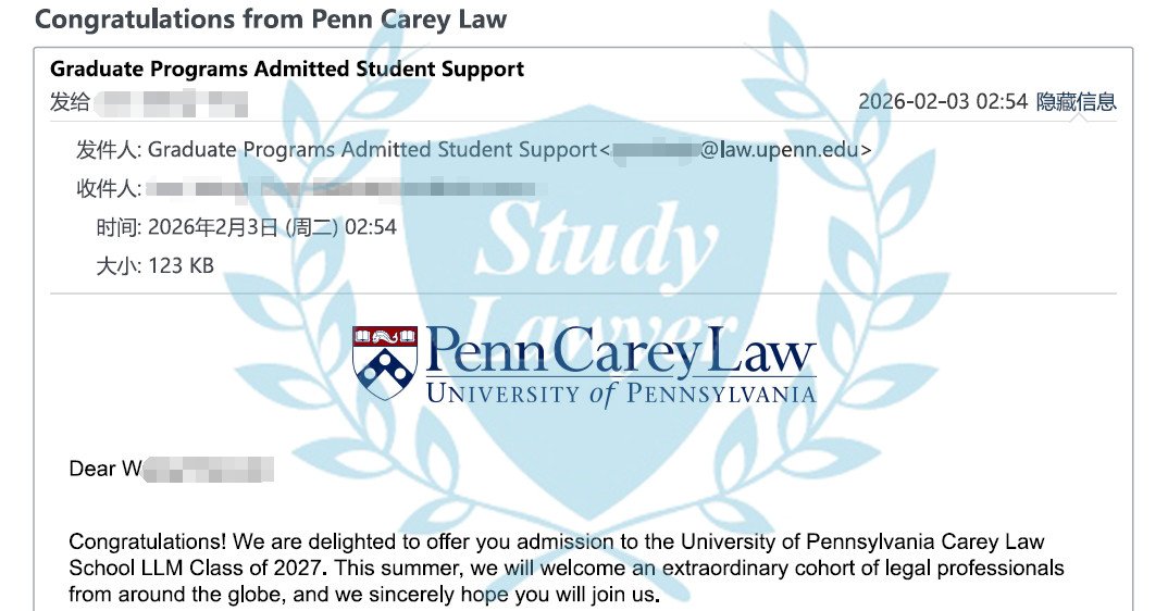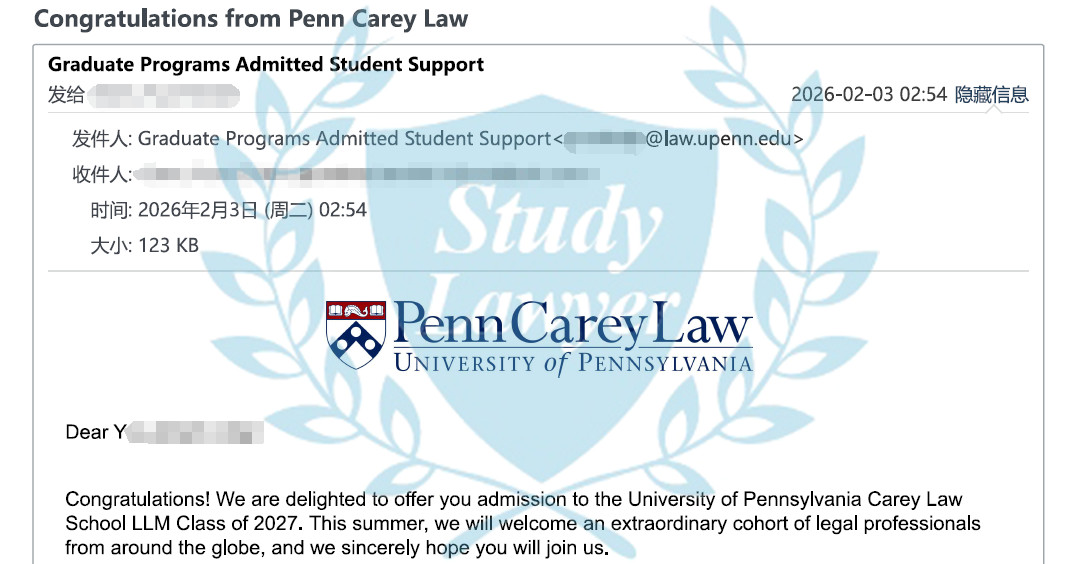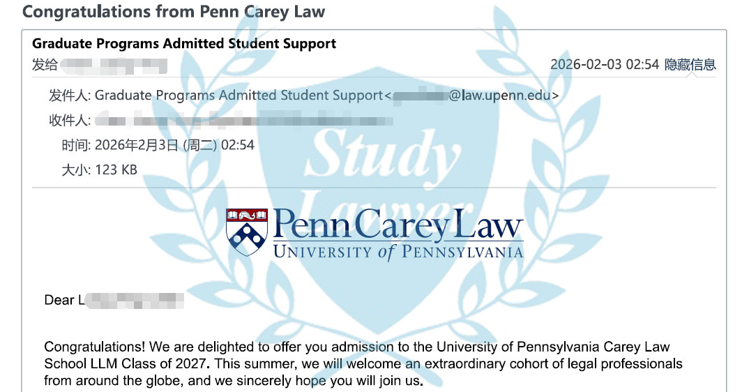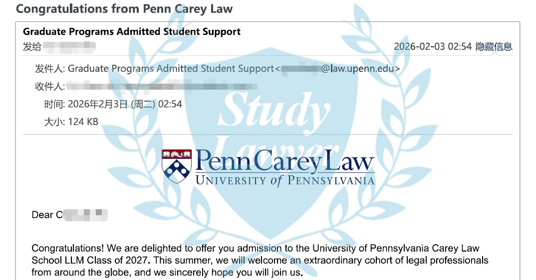 今天,又有10位左右的學律申請者收到了在US News最佳法學院排名中位列第5的賓夕法尼亞大學Carey法學院的LLM錄取通知,恭喜!