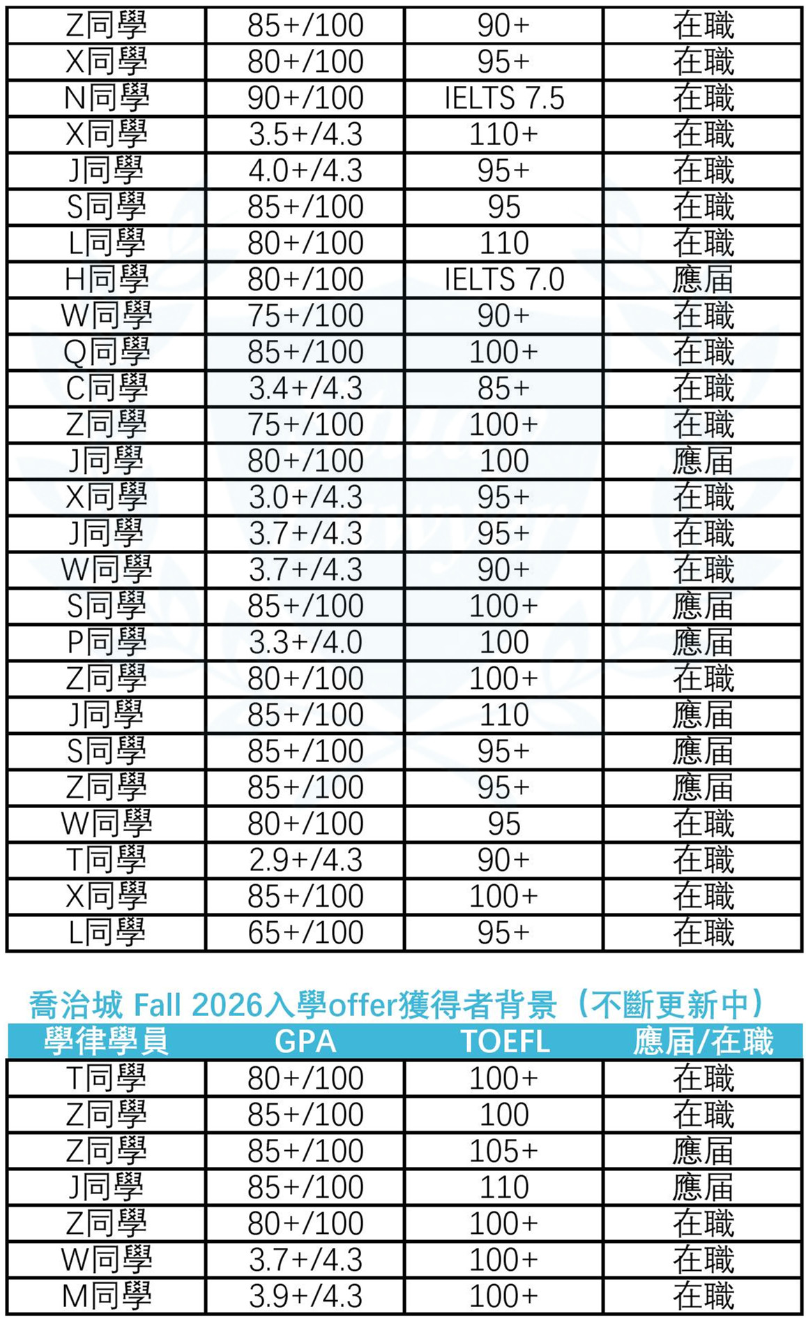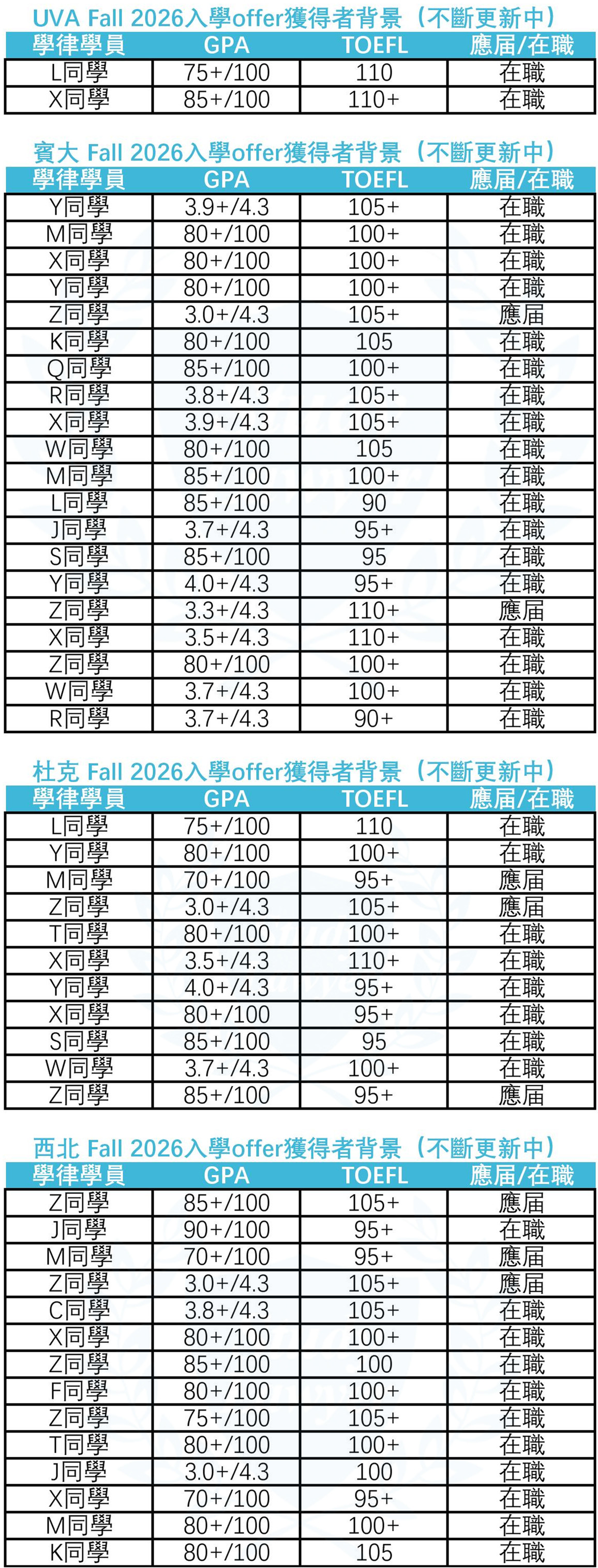 美國T14法學院LLM方面,學律申請者已收到offer總計80張,包括維吉尼亞大學2張、賓夕法尼亞大學20張、杜克大學11張、西北大學40張和喬治城大學7張。隨著申請季的推進,相信學律申請者將收到更多頂尖法學院offer。