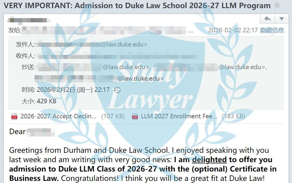 除賓大外,杜克大學法學院也在繼續放榜中,今天又有一位申請者收到了杜克的LLM預錄取通知: