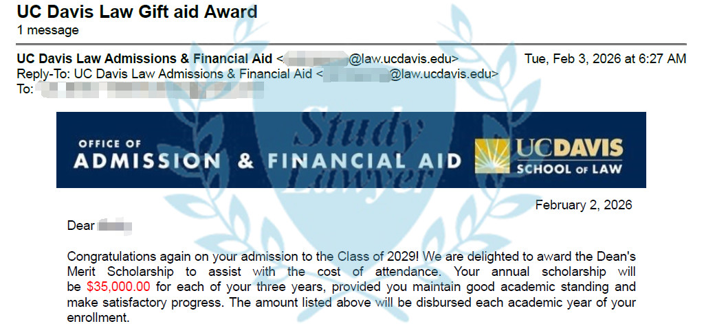 JD項目的放榜也在繼續,近日有申請者收到UC Davis今年入學的錄取通知以及三年共計10.5萬美元的獎學金offer。