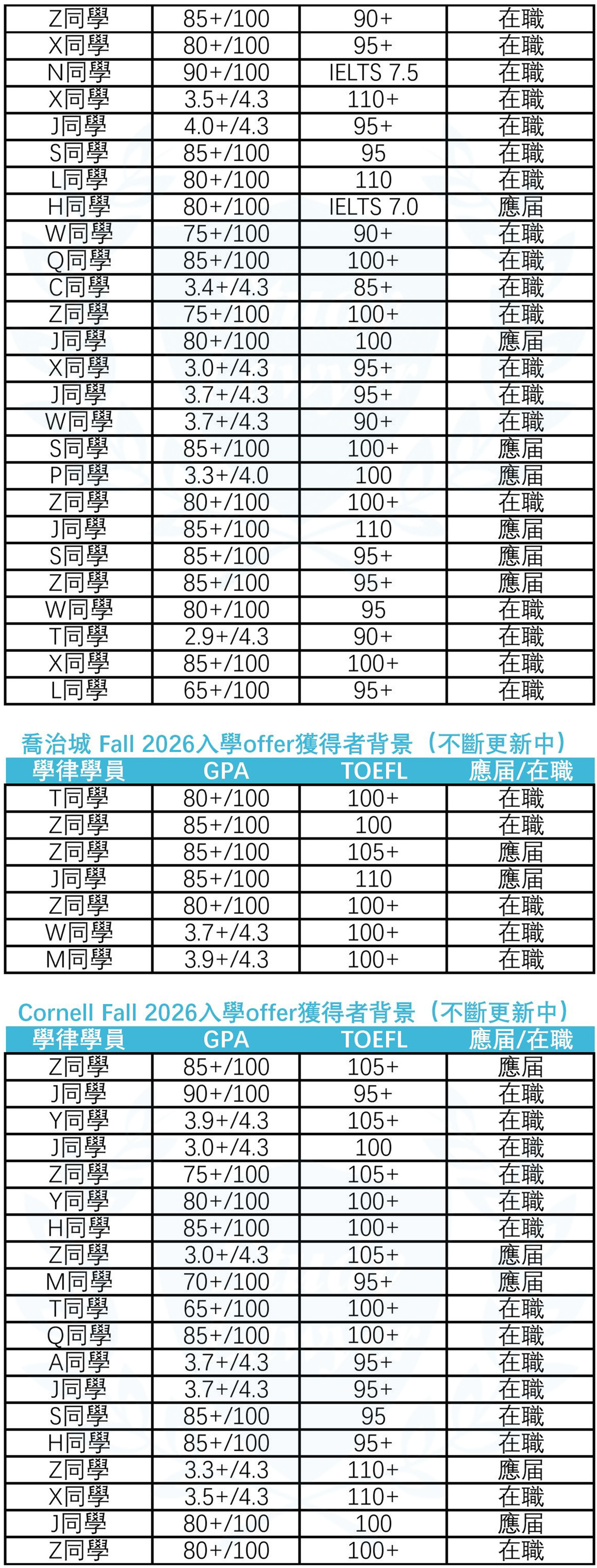 目前為止,學律申請者已收到美國T14法學院LLM offer總計百餘張,包括維吉尼亞大學2張、賓夕法尼亞大學20張、杜克大學11張、西北大學40張、喬治城大學7張和康乃爾大學24張。隨著申請季的推進,相信學律申請者將收到更多頂尖法學院offer。