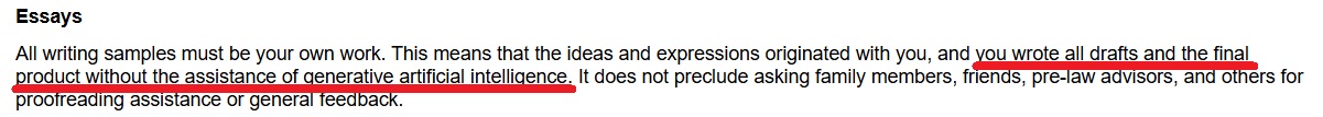 申請人必須準備以自身風格撰寫的文書和其他申請材料,這些材料不能有抄襲現象,且要真實反映作者的經歷和思維過程。許多法學院要求申請人通過申請認證流程確認他們在準備法學院申請時未使用生成型AI。有些法學院明確要求申請人證明他們未使用生成型AI,而其他法學院的認證聲明則要求申請人確認所有作品均為其本人所創作,並將使用生成式AI認定為違反該認證聲明。