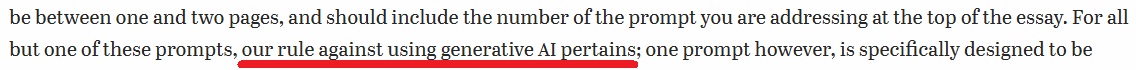 “所有寫作部分必須是你自己的作品。這意味著這些想法和表達源自你本人,所有的草稿和成品都不能借助生成式人工智慧的幫助。”