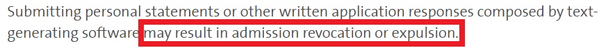 “提交由文本生成軟體編寫的個人陳述或其他書面申請回復可能會導致入學資格被取消或被開除”。